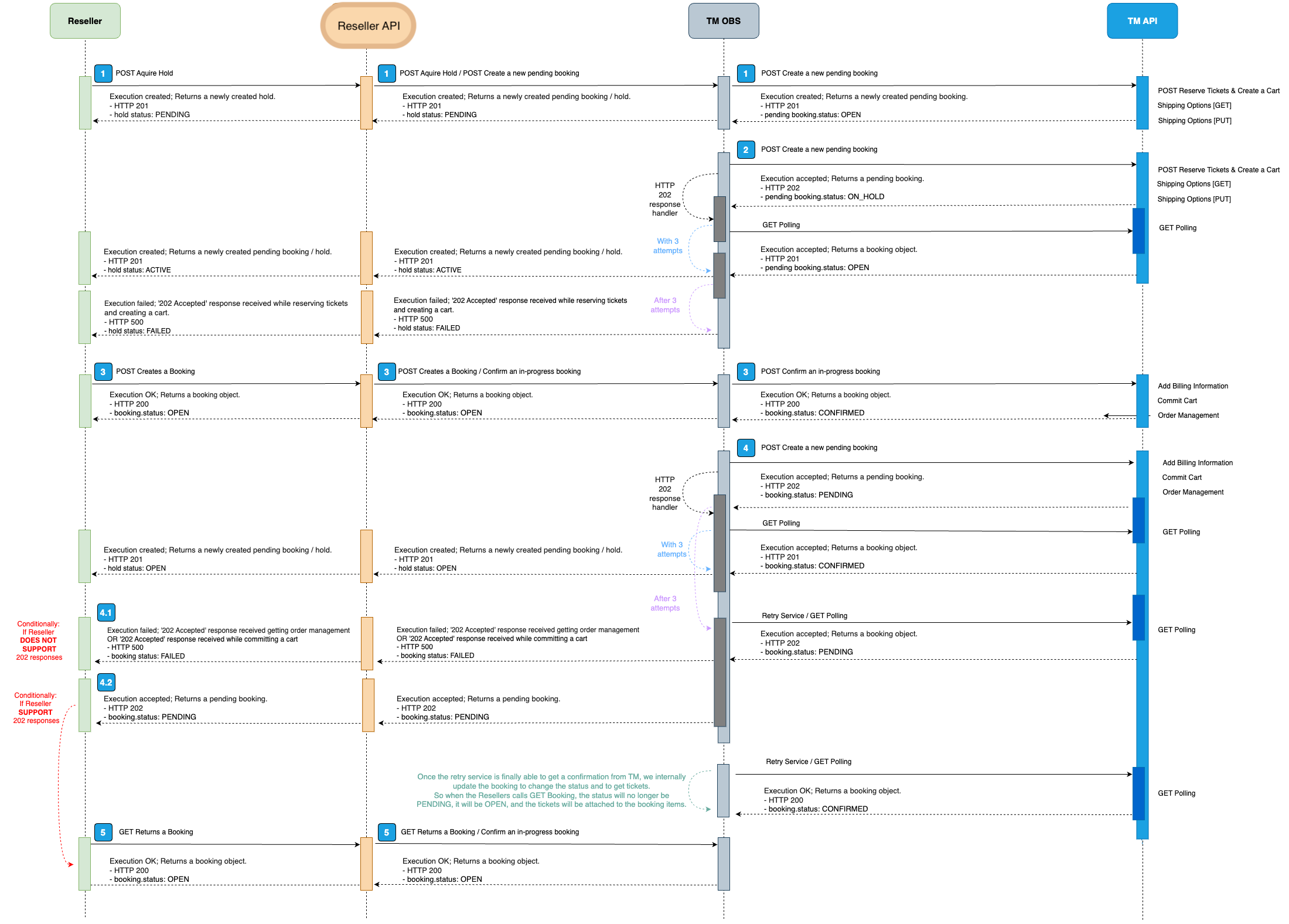 If you and the operator support pending booking functionality, an HTTP 202 response may be returned during the booking flow. Tickets will not be returned with a 202 response, instead, you must regularly fetch the booking ID from the GET Booking API endpoint to retrieve the confirmed tickets when the booking transitions from PENDING status to OPEN. This is recommended for those Resellers partners like you who want to connect to high volume systems or live event systems. These are the systems typically using 202 Pending booking responses.